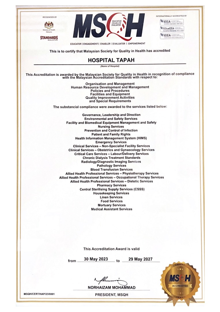 Tahniah diucapkan kepada Hospital Tapah di atas penganugerahan Pensijilan Penuh Akreditasi MSQH bagi tempoh 4 tahun mulai 30 Mei 2023 hingga